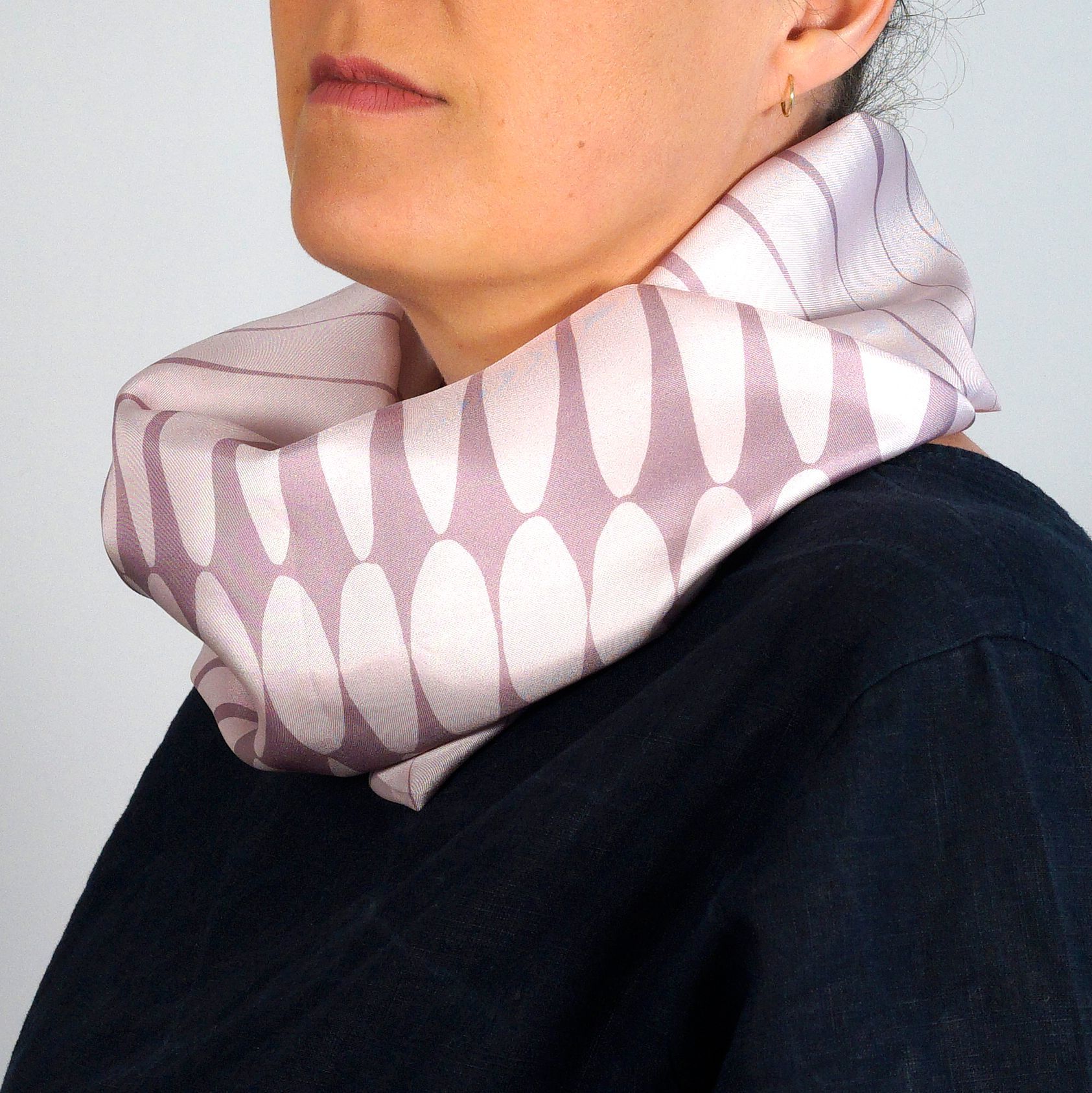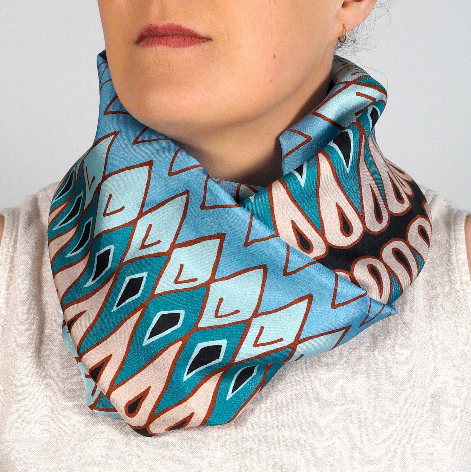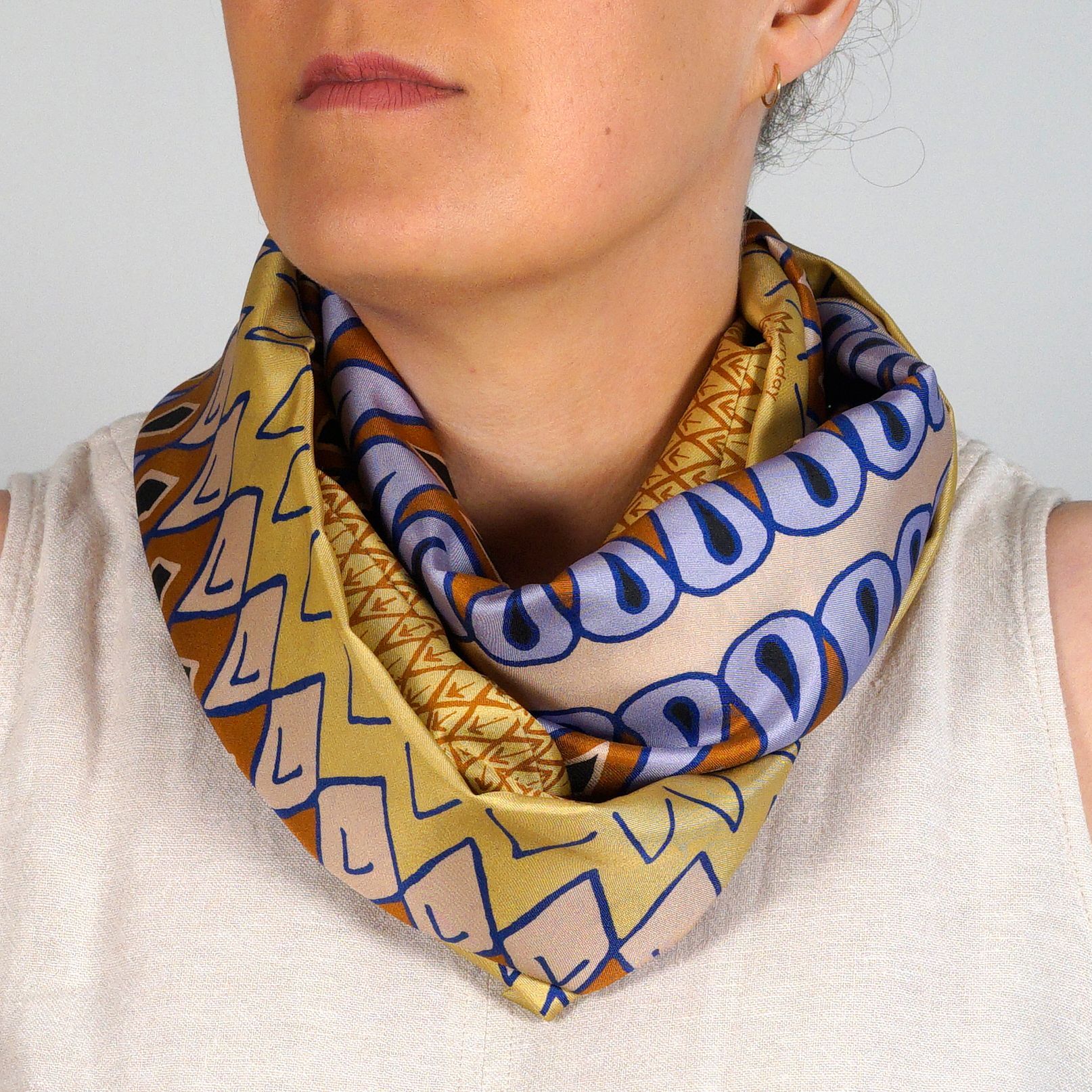 With the silk scarves, I create contemporary designs with divine colour combinations. While scarves are a practical item, I approach them like jewellery, aiming to create something that makes the wearer feel both beautiful and confident. I focus on flattering colours and look at how the patten interacts with the folds and drapes of the fabric.